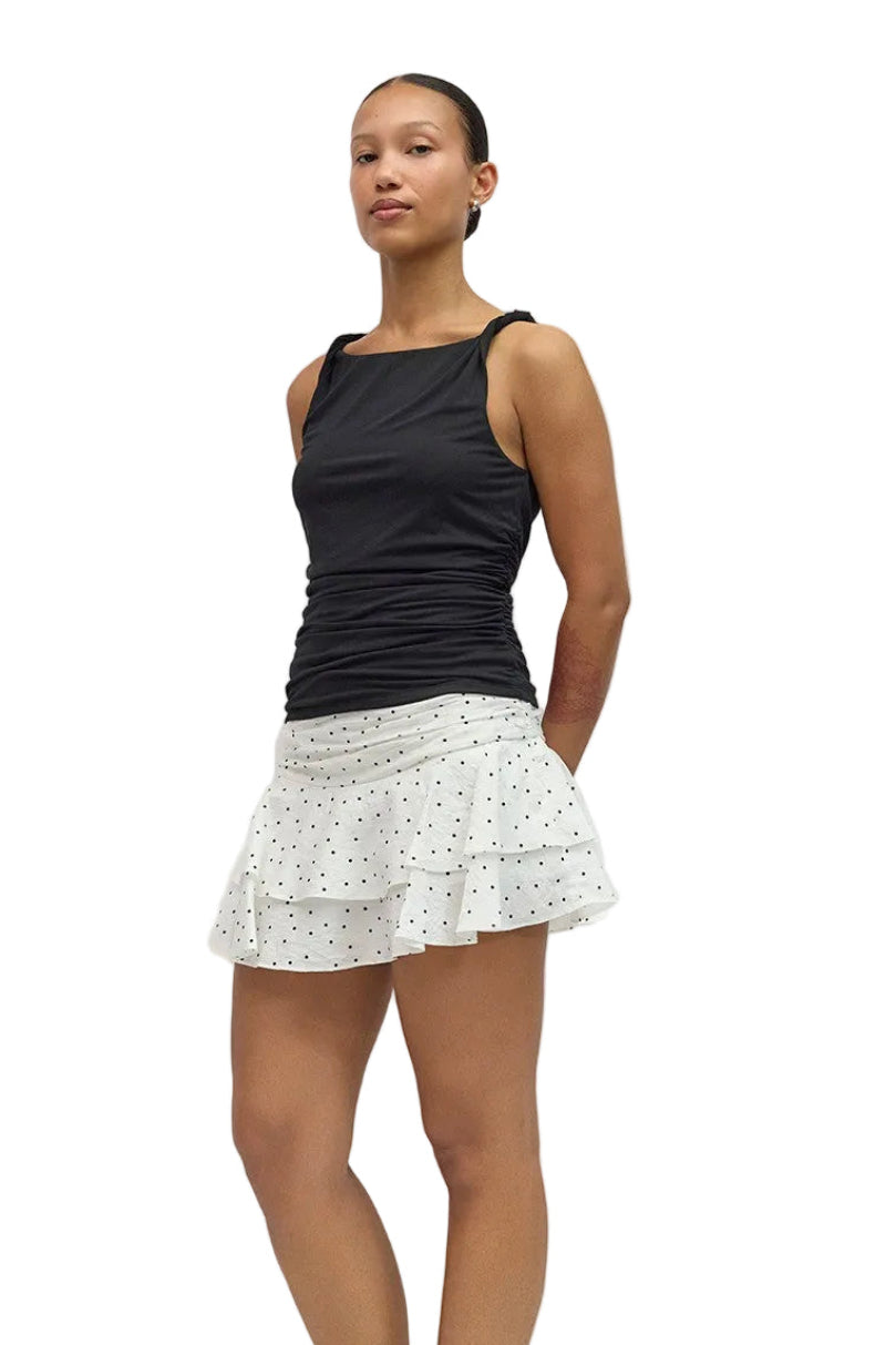 A fitted sleeveless style crafted from a soft modal-type knit. Designed with a wide neckline and twist straps, it's finished with a gently ruched waist that shapes the silhouette with ease.